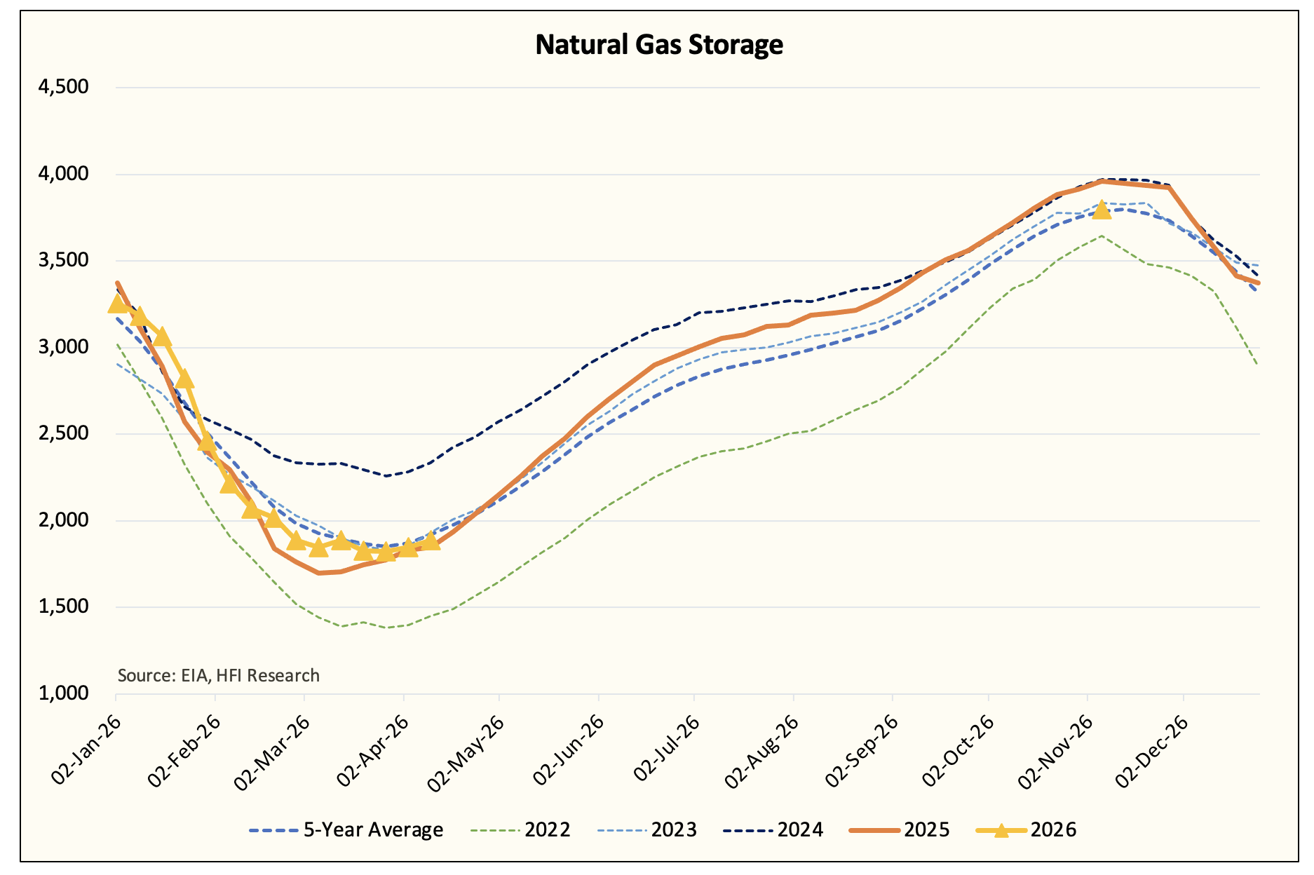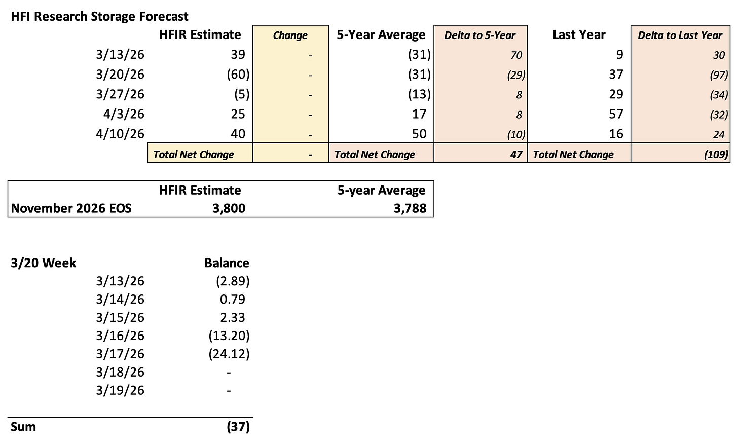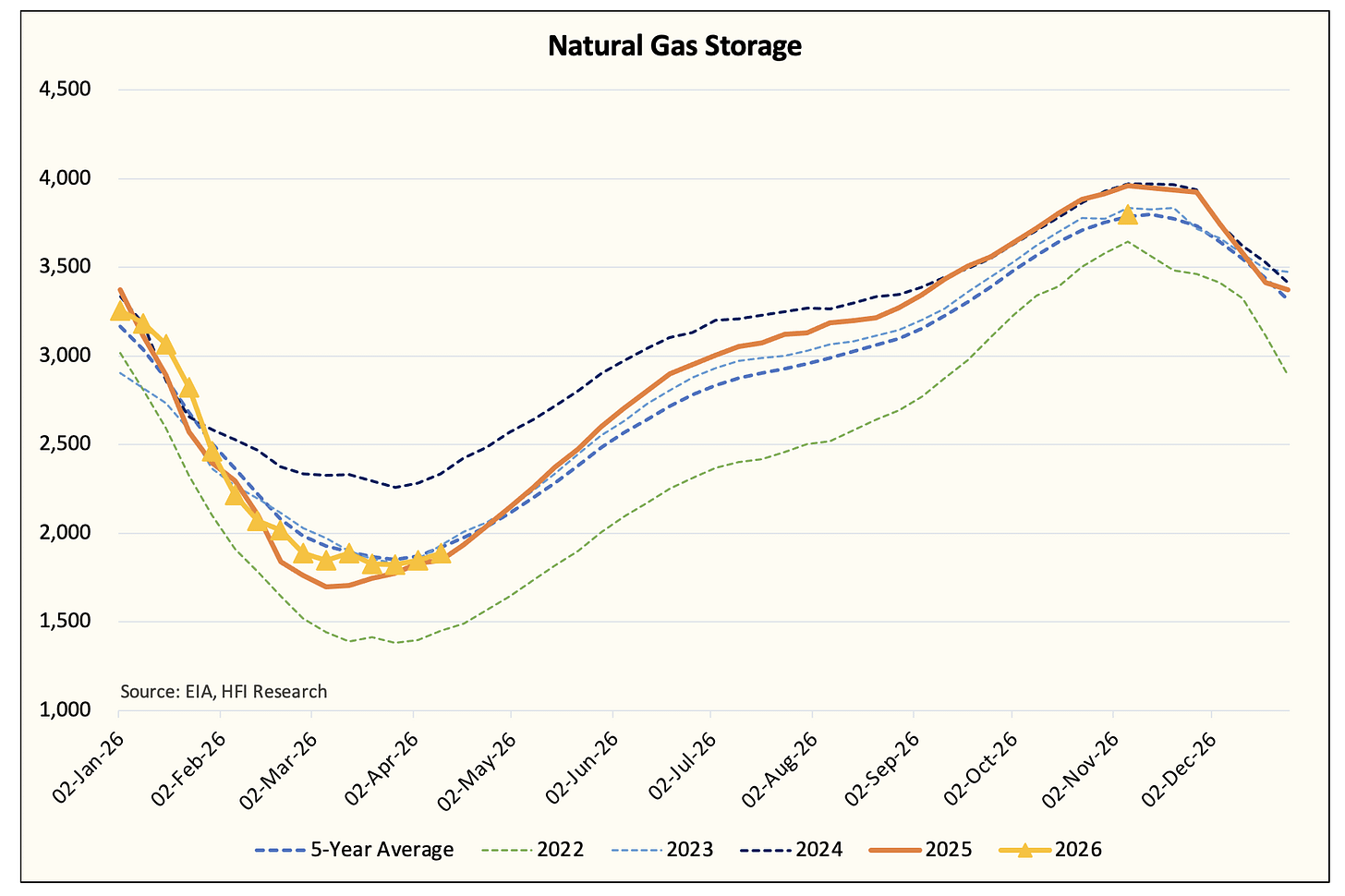 We are projecting November 2026 EOS at 3.8 Tcf, which is slightly above the 5-year average of 3.788 Tcf. If you are wondering why natural gas prices aren’t trading higher, then look no further than this storage projection.