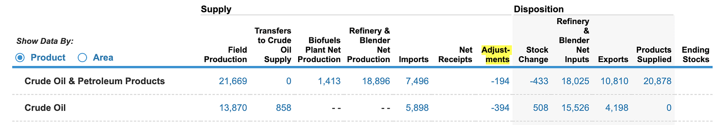 But the reality underneath is different. The adjustment factor was reported at -394k b/d, suggesting that the real US crude oil production figure was 13.476 million b/d (13.87 - 0.394).