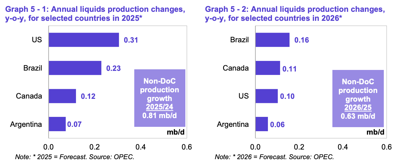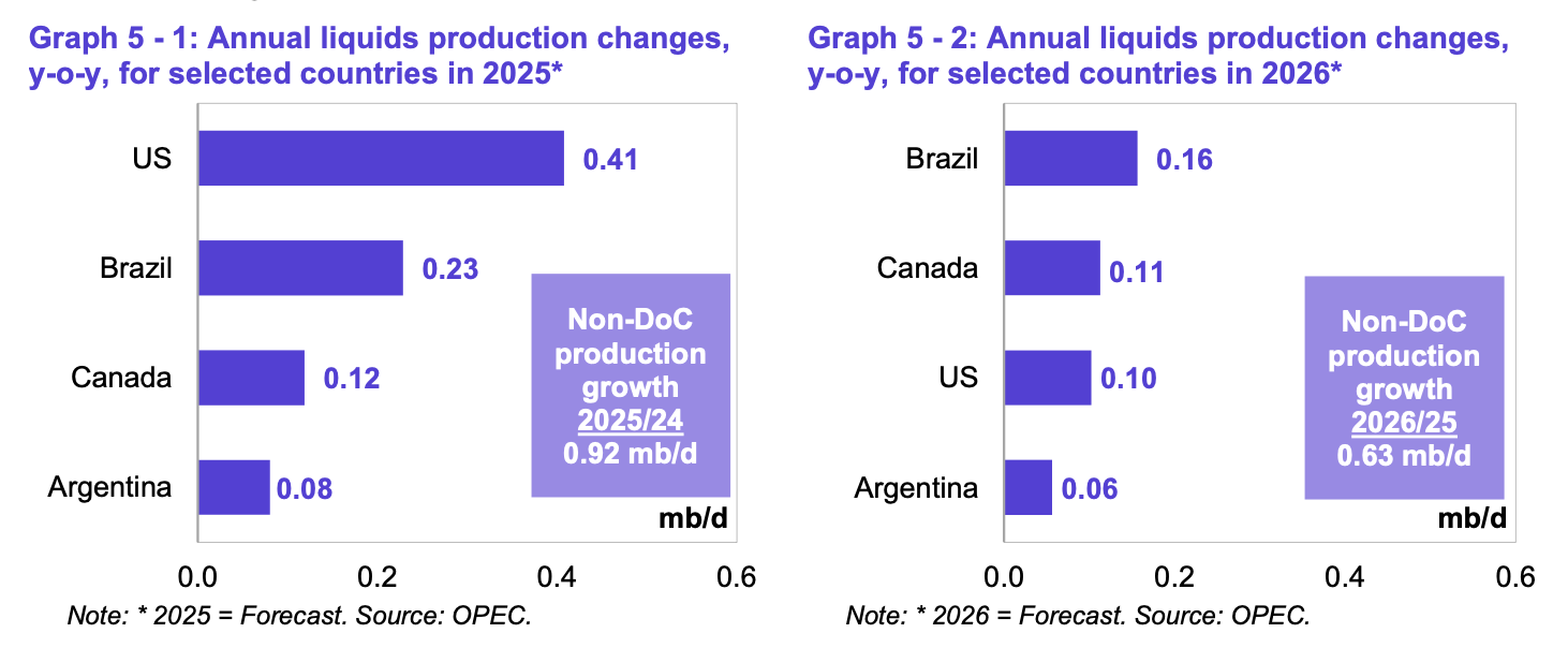 US crude oil production surprised to the upside in Q3 2025. This prompted OPEC to upgrade its non-OPEC supply growth forecast in its latest oil market report.