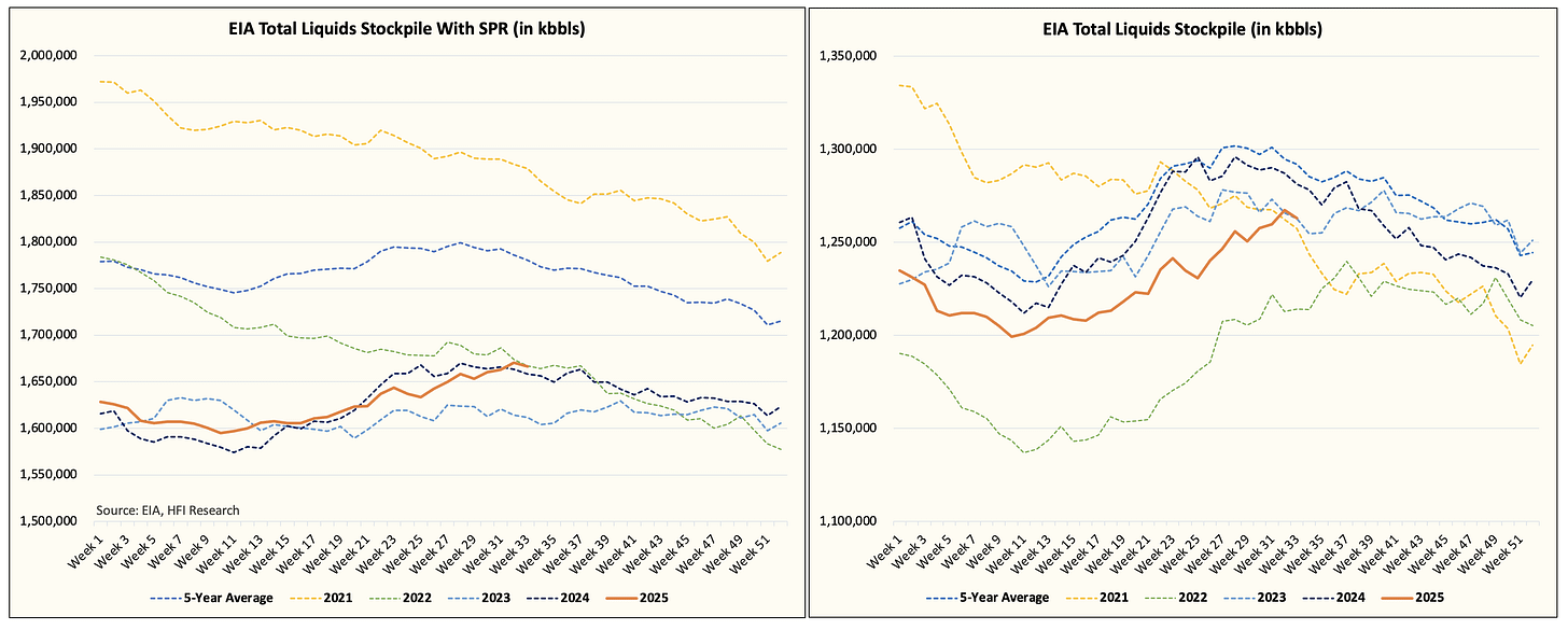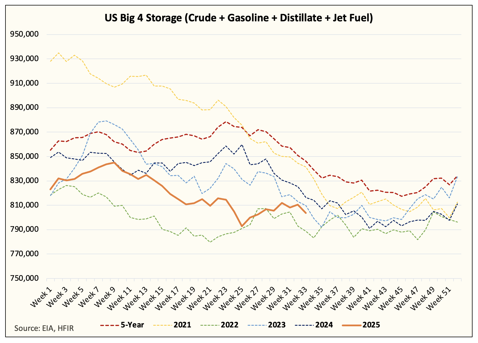 The big 4 (crude, gasoline, distillate, and jet fuel) decreased 7.455 million bbls. In addition, if you look at the relative inventory balance, we are below 2023 and 2024 despite the OPEC+ production increase.