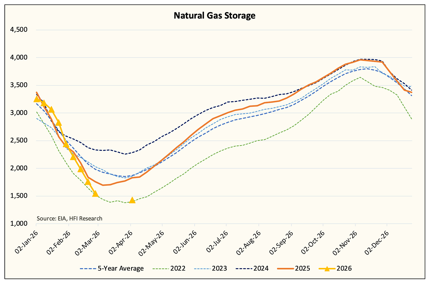 Total gas demand was just shy of the record we saw in 2025, but elevated demand will keep gas withdrawal elevated.