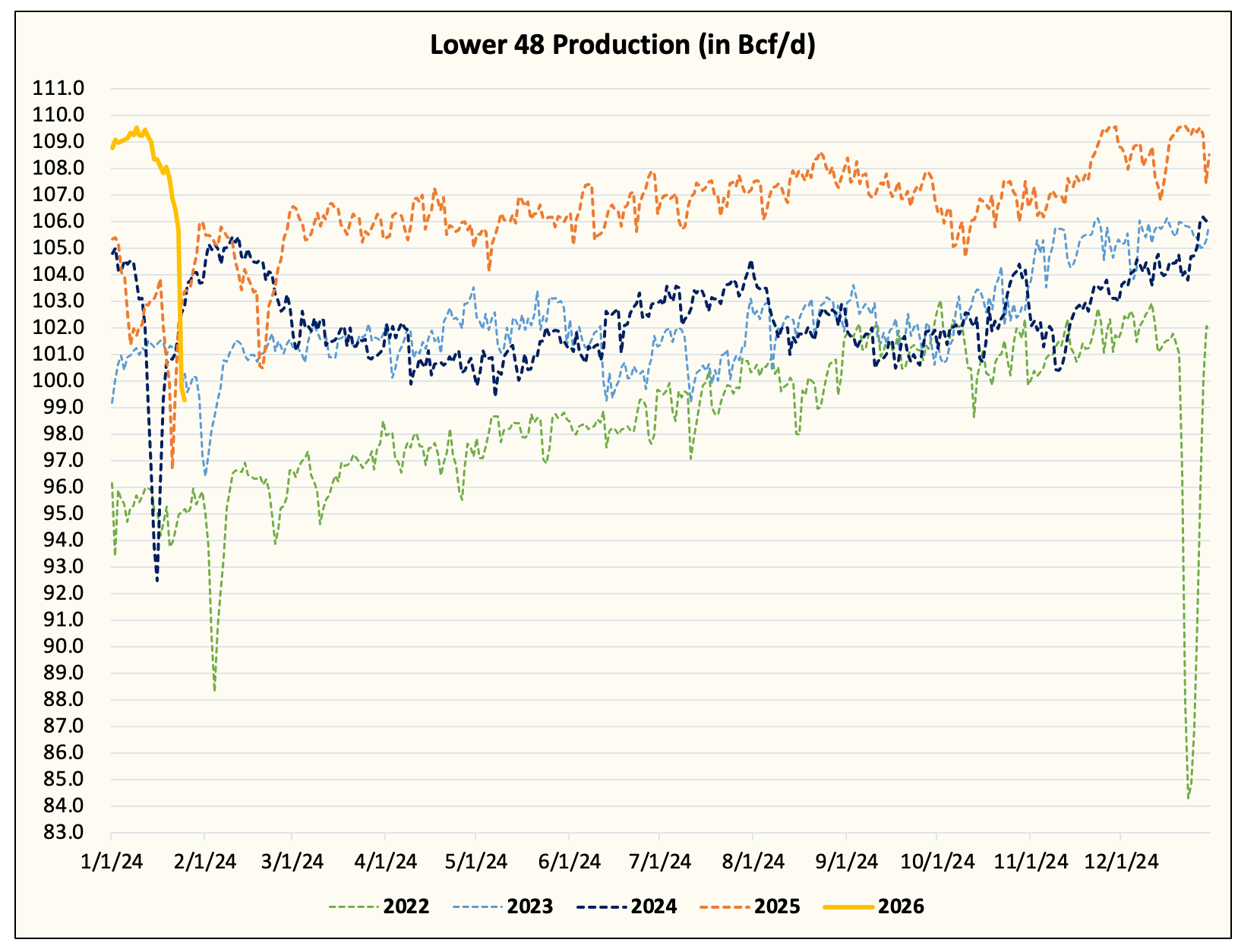 Lower 48 production dropped to ~99.4 Bcf/d.
