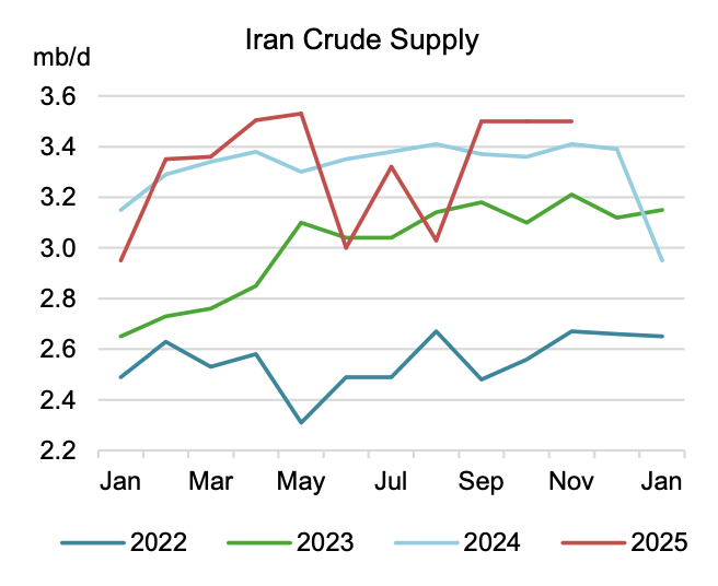 There’s major importance in this when we look at the global oil market. Iran is a big player with crude exports averaging ~2.2 million b/d (including shadow fleets) and producing ~3.5 million b/d of crude oil.