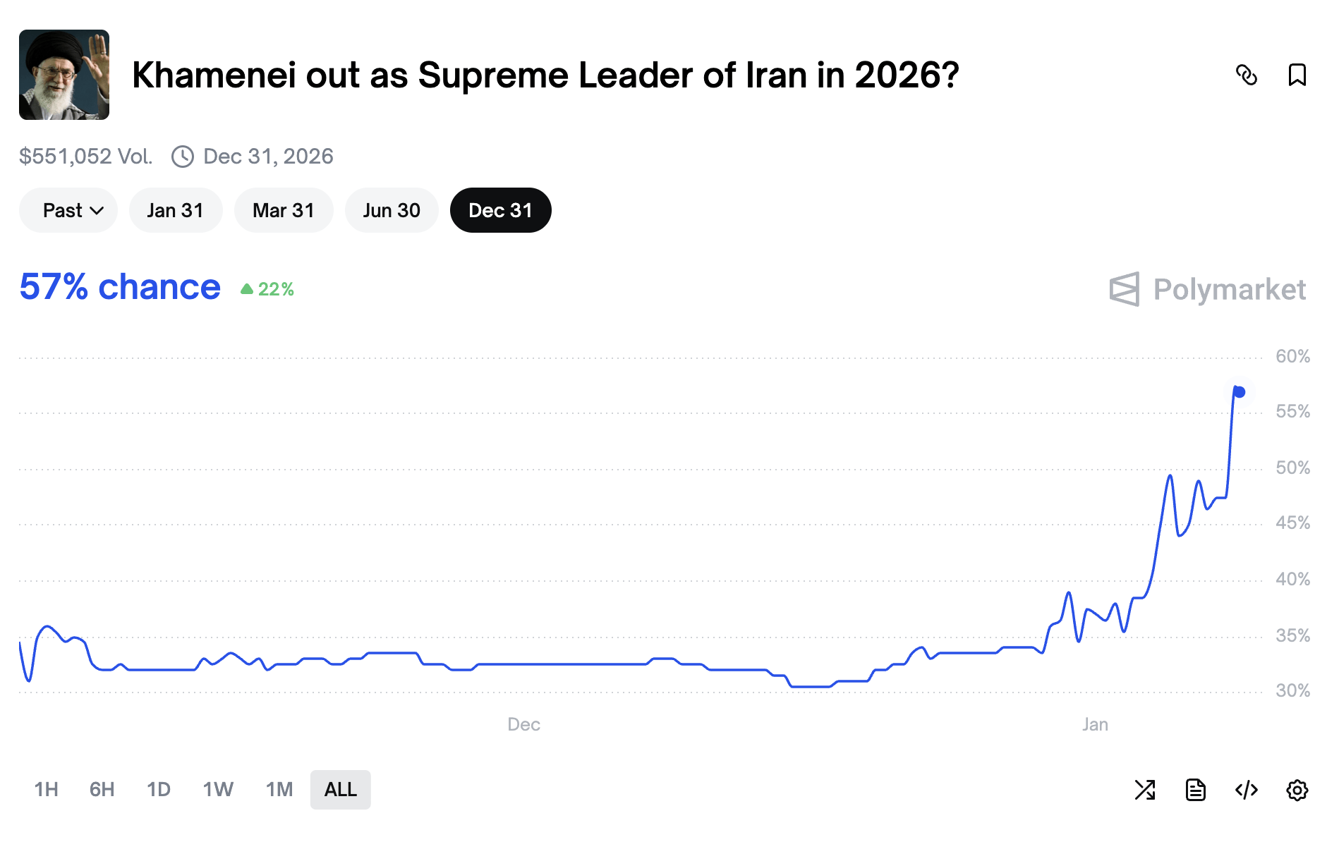 The start to this year is unlike any other year we’ve seen. Well, perhaps except for COVID, which was once in a lifetime type of event, but you get my point. First, the market was taken aback by the development in Venezuela last weekend, where Maduro was captured. Now, we have the social unrest developing in Iran. The most important indicator for me is the betting market on Khamenei exiting before the end of 2026.