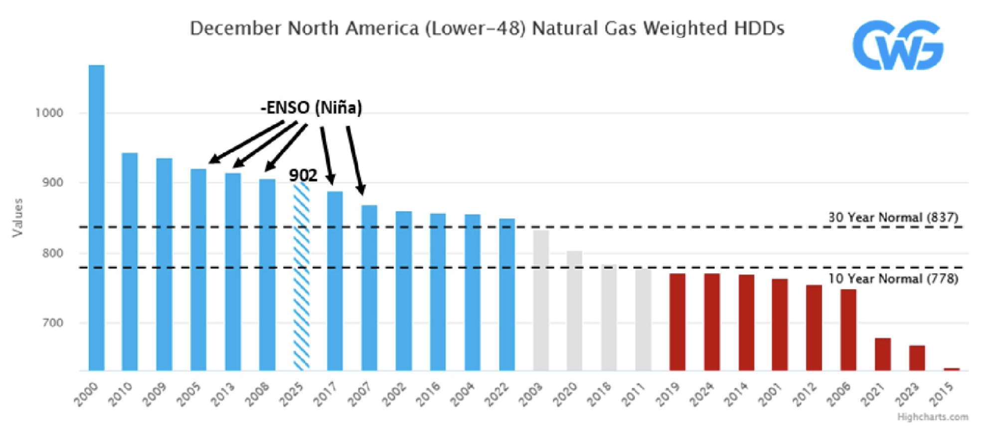 According to Commodity Wx Group, December 2025 is expected to be colder than normal.