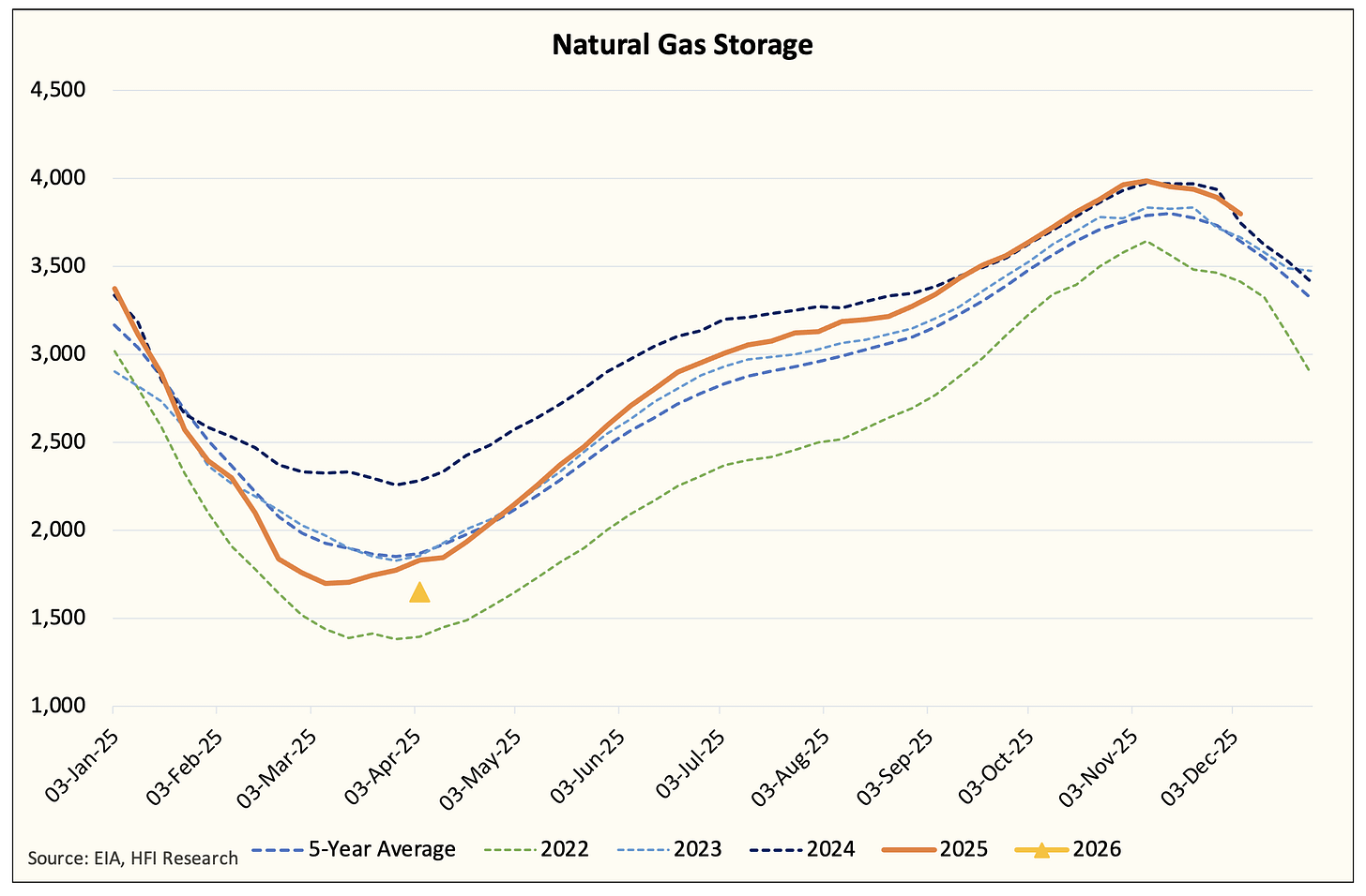 By our estimate, the latest projection still shows April natural gas storage around ~1.65 Tcf. In a bearish heating demand scenario (2023-2024), we have natural gas storage finishing near ~1.9 Tcf.
