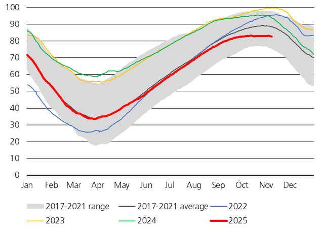 In our base case, once the storage surplus dwindles, natural gas prices will respond asymmetrically to changes in the heating degree days. We think the market is biased to the bull side, given the deficit we explained above.