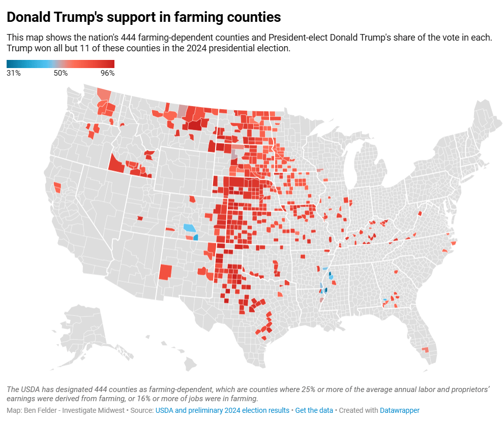 The administration is heavily incentivized to support the agriculture community due to its staunch support of Trump. The map below illustrates the extent to which farming communities voted for Trump in the 2024 presidential election.