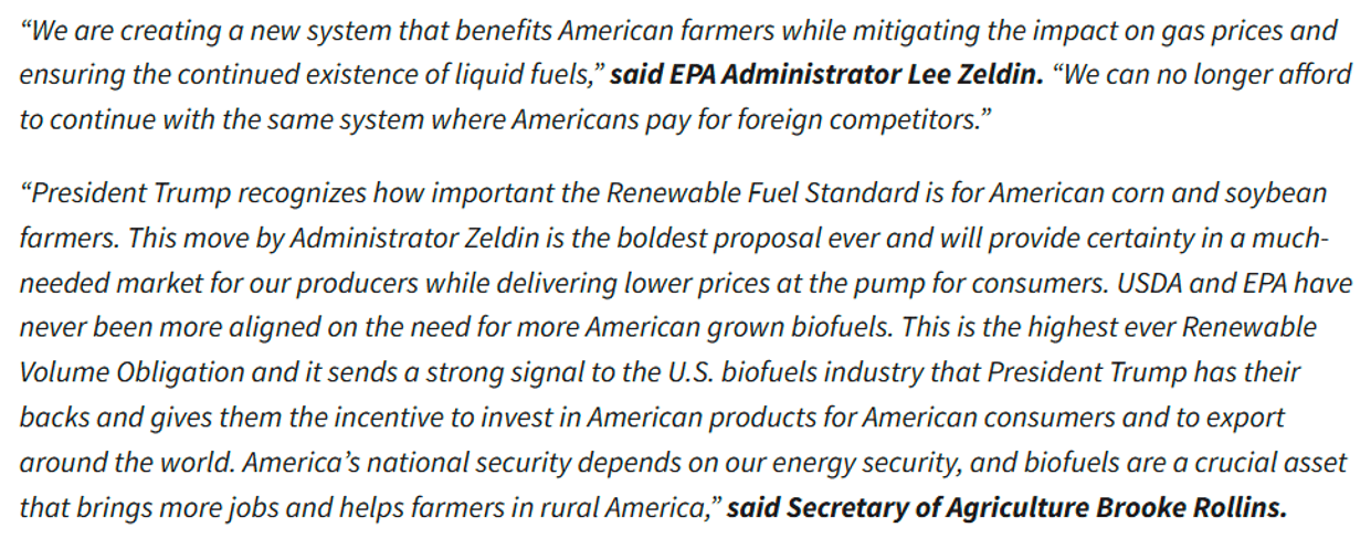 In the EPA’s press release accompanying the RVO proposal, EPA Administrator Lee Zeldin and Secretary of Agriculture Brooke Rollins were quoted as saying the following. Notice their explicit support for agriculture.
