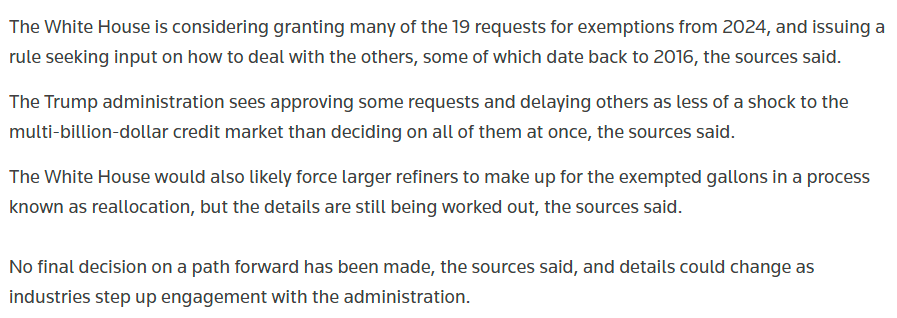 As for “the small refinery exemptions” (SREs) in the Bloomberg poll, this is where politics enters the picture.