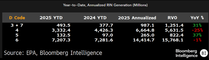 With regard to the “2024 carryover RINs” mentioned in the chart above, Bloomberg provides the following table displaying the most recently released EPA data on biofuel production. It shows that for the biomass-based diesel producers—collectively referred to as D4, the second line down on the table—recent blending volumes on an annual basis are tracking 25% below the current RVO on an annualized basis. This represents a massive amount of biomass-based diesel underproduction relative to the 2025 RVO.