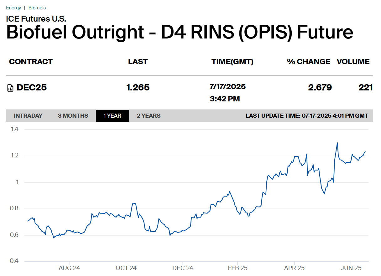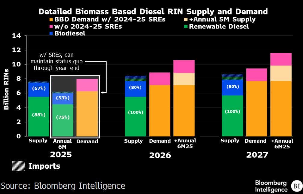 The large number of carried-over RINs was creating an overhang on 2025 biofuel margins. Obligated refiners had until June 30 to submit their carried-over 2024 RINs.