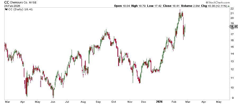 Chemours CC 0.00%↑ reported fourth-quarter 2025 results last Thursday, February 19. The results fell short of consensus expectations and caused the shares to decline by 25% from peak to trough over two days. After bottoming at $16.15, the shares have since recovered to $18.41, still shy of their recent high before earnings of $21.85.