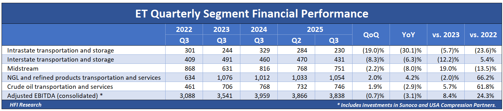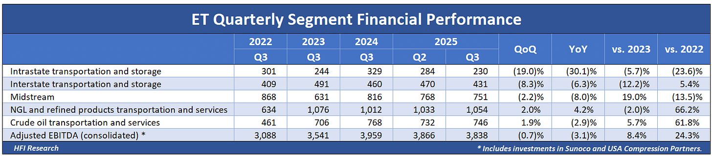 Financial results for the third quarter were disappointing, falling short of analyst and my own expectations. ET reported Adjusted EBITDA of $3.8.3 billion, missing analyst expectations of $3.97 billion by 3.5%. Results were weaker than both the previous year’s and the previous quarter’s results, as shown below.