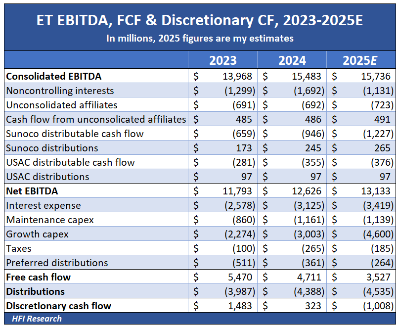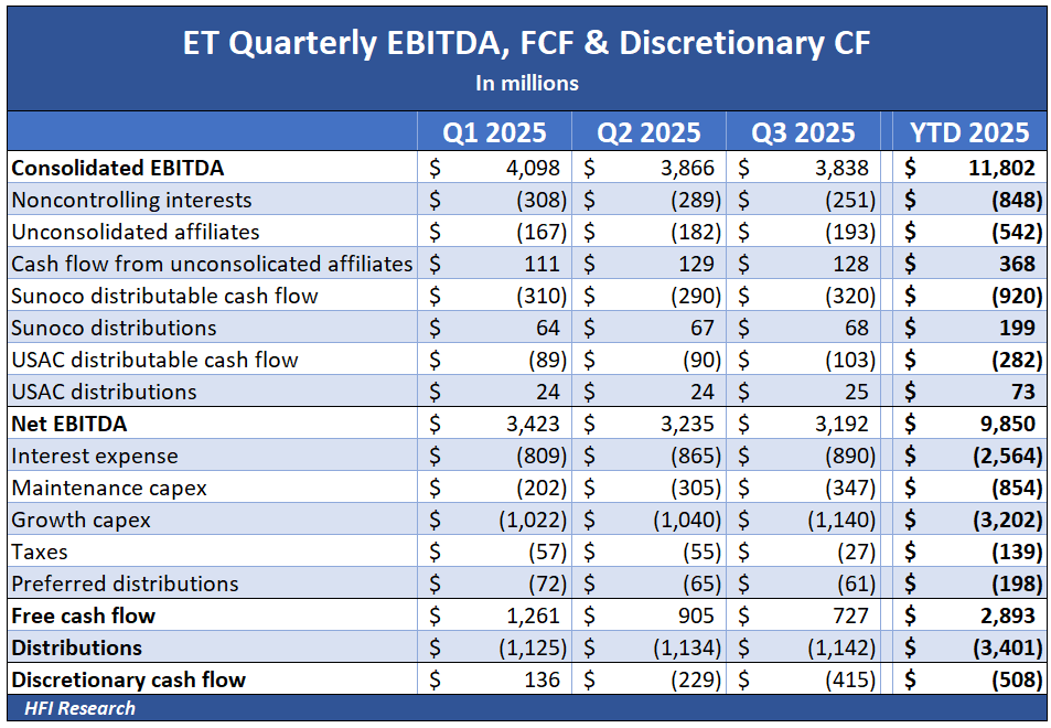 ET is currently tracking at full-year Adjusted EBITDA of $15.74 billion, approximately 4% below the lower end of management’s initial full-year guidance range of $16.1 to $16.4 billion. The table below shows how full-year 2025 performance is tracking. Growth capex is adjusted higher, to $4.6 billion, consistent with management’s guidance. ET will have to fund its $1 billion cash flow shortfall with additional long-term debt.