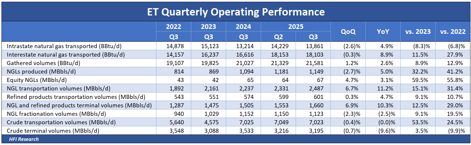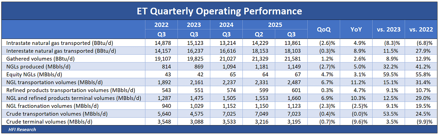 The trend underlying ET’s operating results remains intact. Volumes continue to increase across the board, with the exception of the intrastate natural gas transportation segment, as shown in the following table.