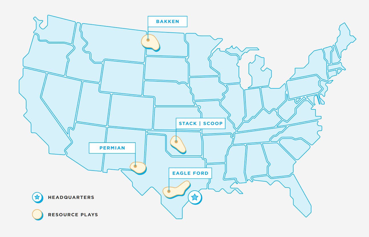 Marathon Oil (MRO) is a U.S. E&P that produces approximately 405,000 boe/d with a production mix of 50.4% crude oil, 24.2% NGLs, and 25.4% natural gas. It operates in major U.S. shale basins and Equatorial Guinea, where it produces primarily natural gas. Its U.S. operations are shown below.
