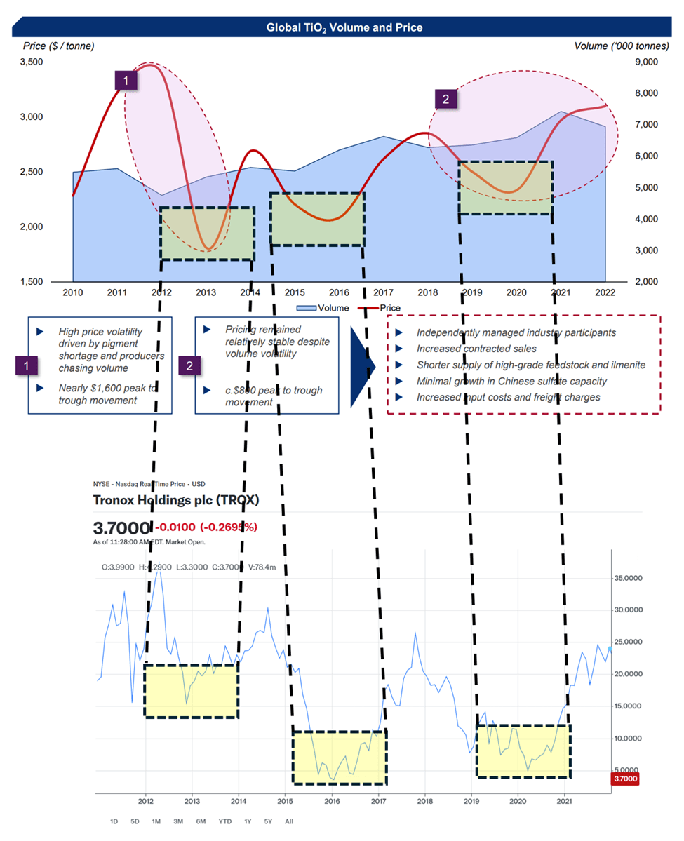 Historically, the company has exhibited some of the most extreme cyclical price swings of any company I know. The chart below illustrates how closely its share price follows the ups and downs of titanium dioxide prices. It depicts the market’s swings that occurred from 2010 to 2021.