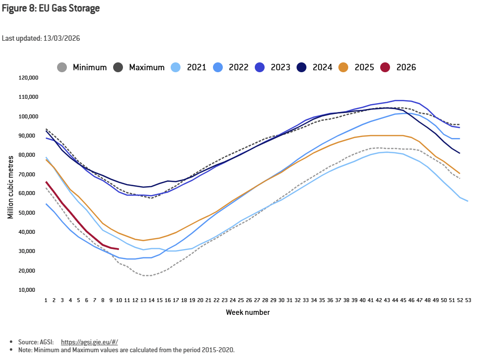 Europe is also vulnerable. European gas storage levels started 2026 at just 50 billion cubic meters, or roughly 46% full, versus 63 Bcm in 2025 and 77 Bcm in 2024.