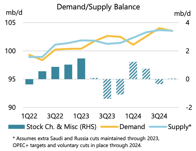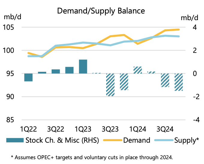 This is an important point to understand. When you model global oil supply & demand balances, the Q4 figure is especially important because it carries over into Q1 of the following year. So in this case, you will see Q4 2023 demand assumptions revised down by 600k b/d. This will have a meaningful effect on balances in Q4 2024, which is down 800k b/d y-o-y.