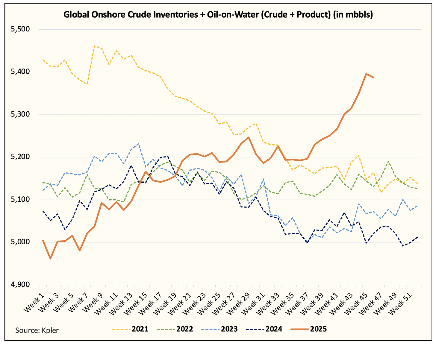 Implied oil market balances in Q4 are on track to be between ~2 to ~2.7 million b/d. This has pushed global onshore + oil-on-water to the second-highest level since COVID.
