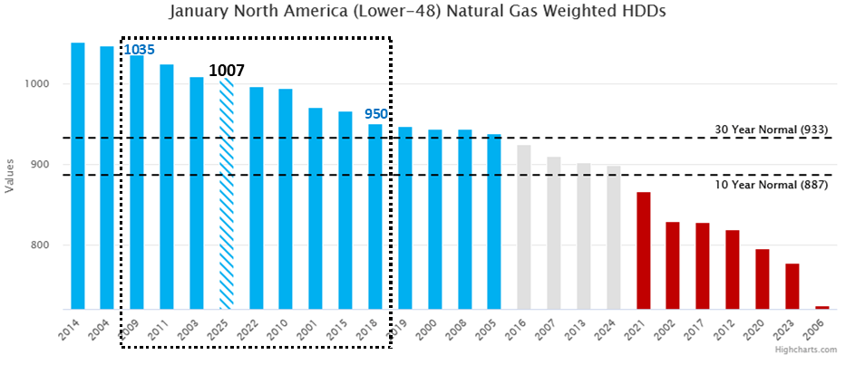 Take 2024, for example, we had a polar vortex hit during the first 2 weeks of January, but warmer-than-normal weather soon followed, which pushed HDDs back to the 10-year norm.