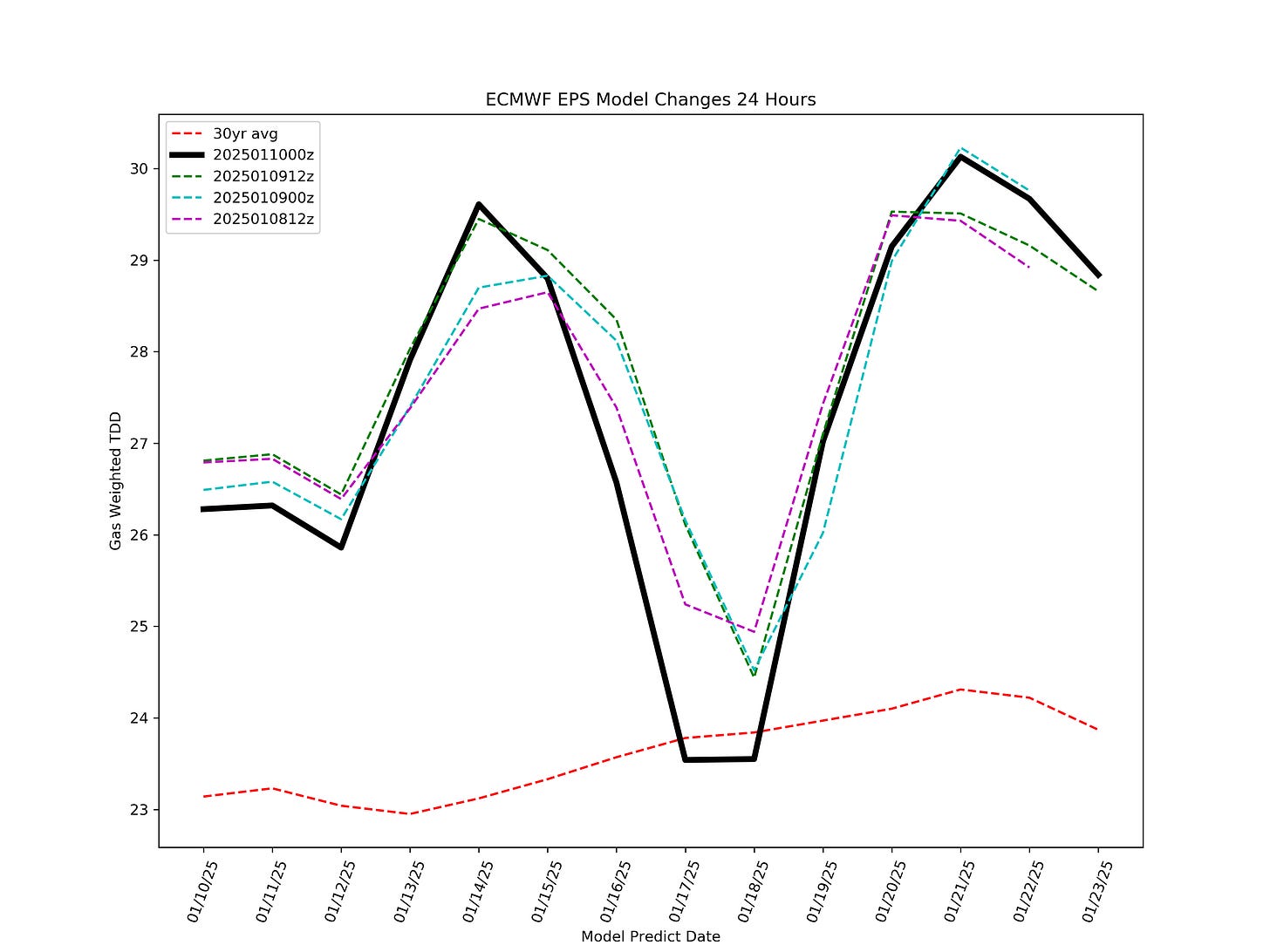 Looking at the latest ECMWF-EPS weather model, we should see elevated heating demand continue until the end of January.
