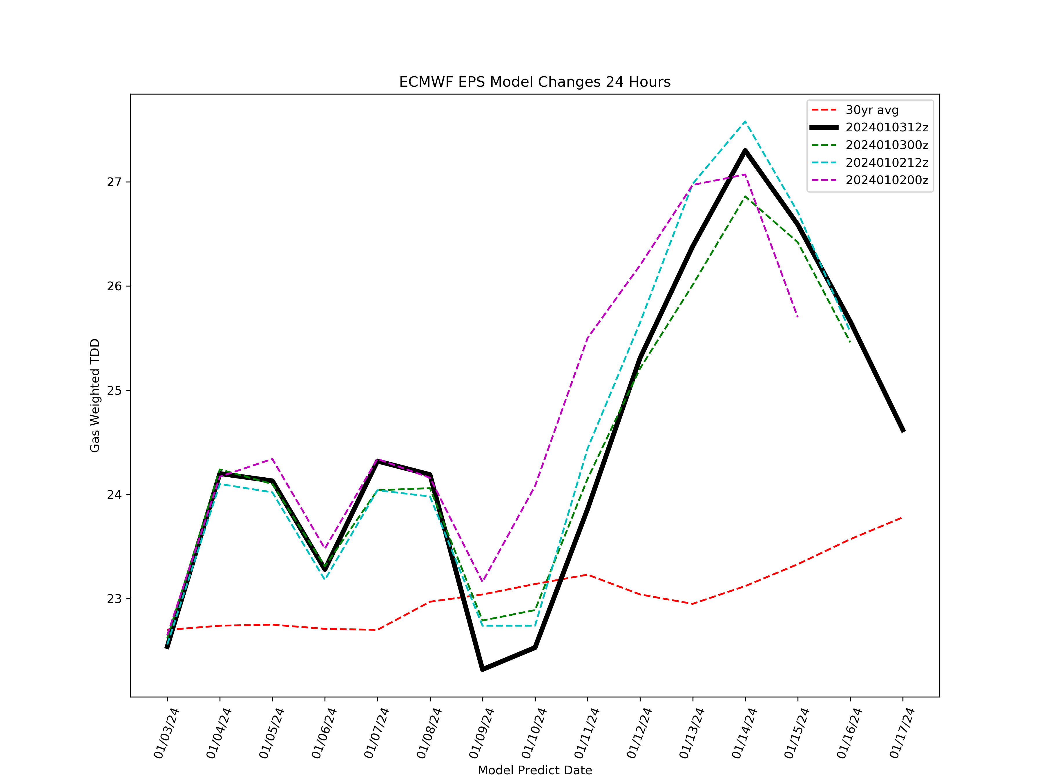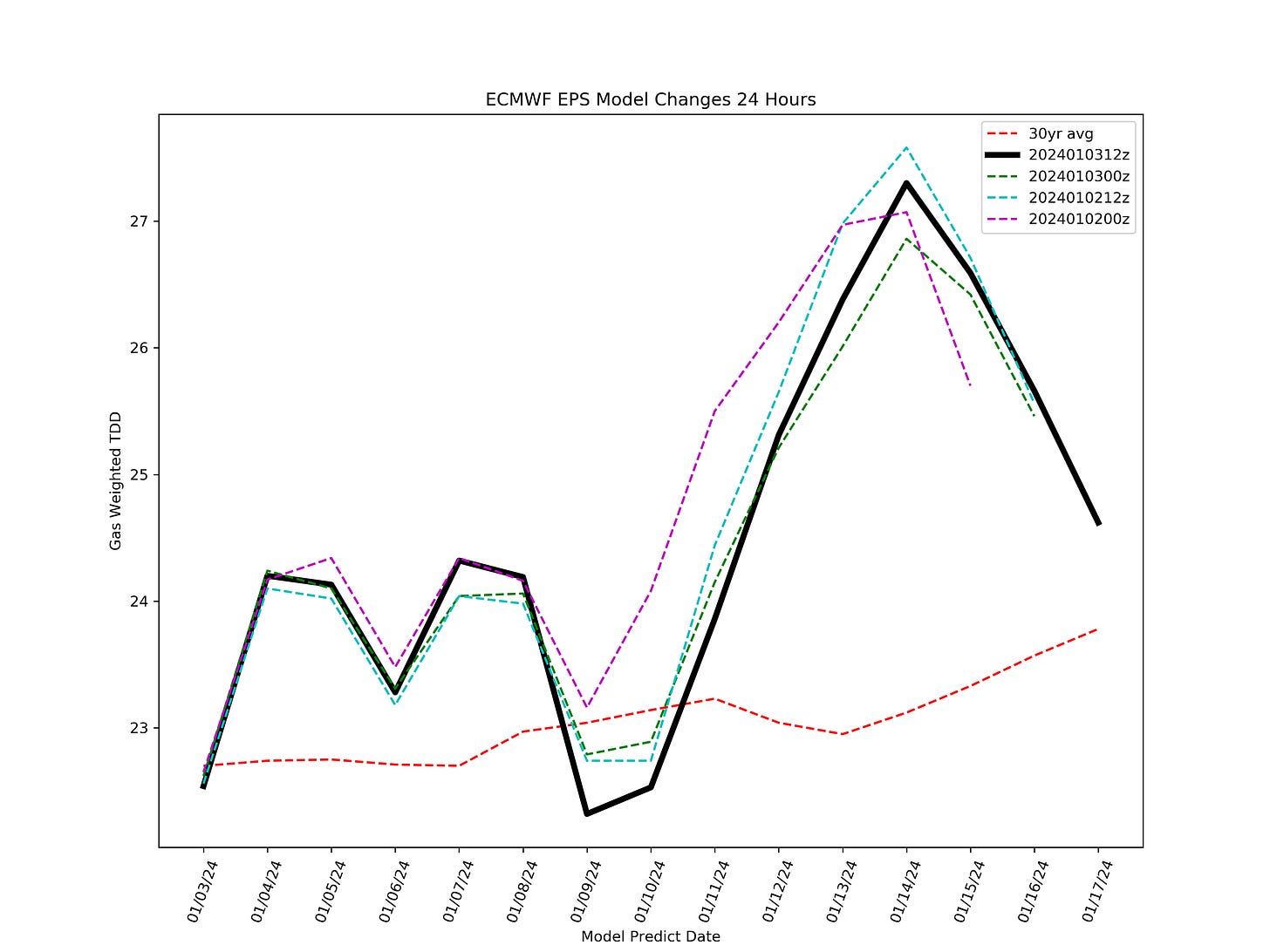 The issue I see here is that the weather models are projecting the cold to escape into the West as opposed to the bullish set-up in the East. Population-weighted heating demand is concentrated mostly on the East coast, so without the Northeast showing substantially colder than normal weather, you won't have a "spike" in demand.