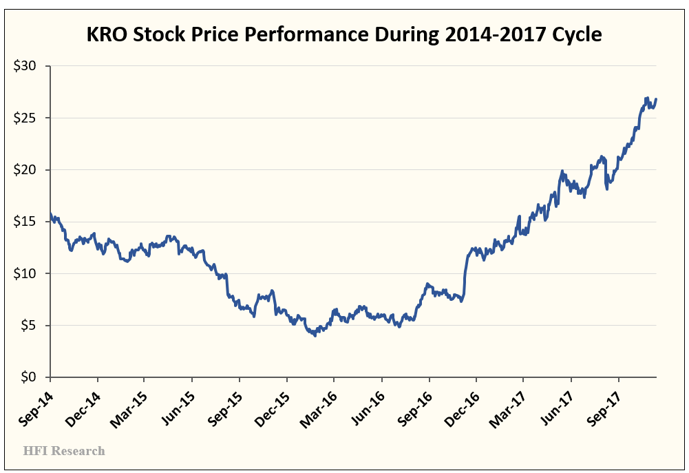 Meanwhile, Kronos (KRO) shares fell 75% before rebounding and then surged 474% from their lows during the 2017 upcycle.