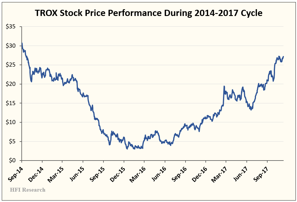 Throughout the entire cycle, titanium dioxide producer stocks mirrored the market’s progress. Over the 2014 to 2017 cycle, Tronox (TROX) shares plunged by 90% before staging a full recovery, as shown below.