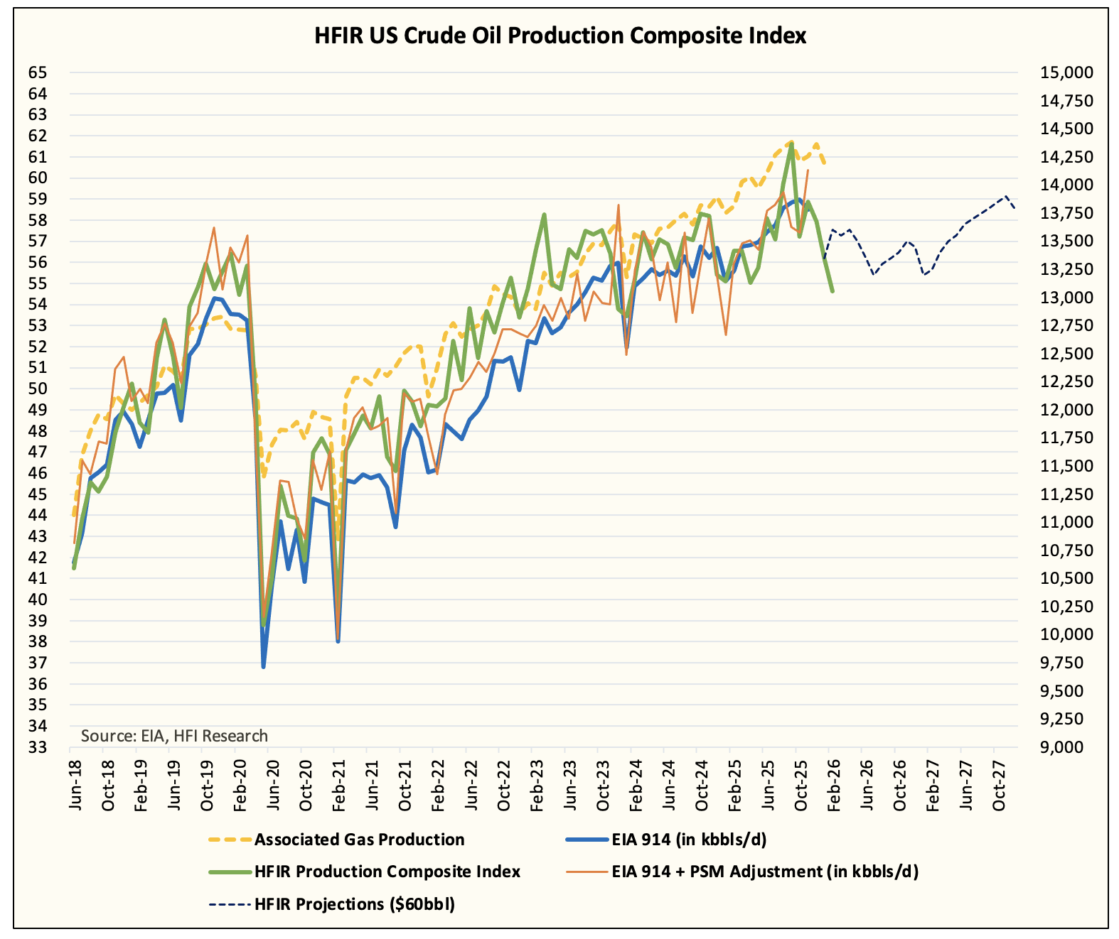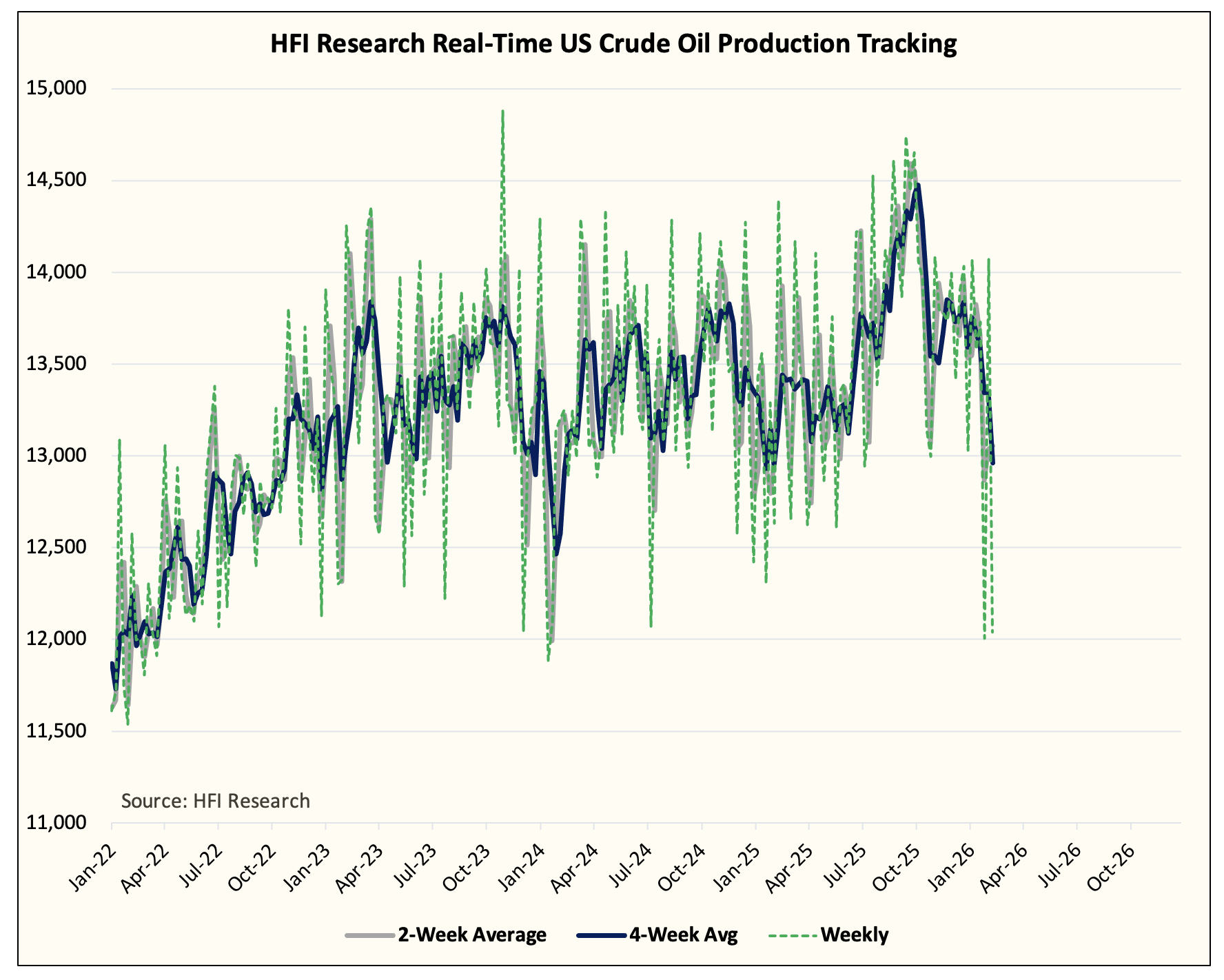Looking at our US production matrix, the disappointment in February is larger than we had expected. We still have two more weeks of data to digest before the numbers are finalized, but it appears US crude oil production will settle in February around ~13.3 million b/d. This is a major drop from the ~13.8 million b/d we saw at the end of 2025.