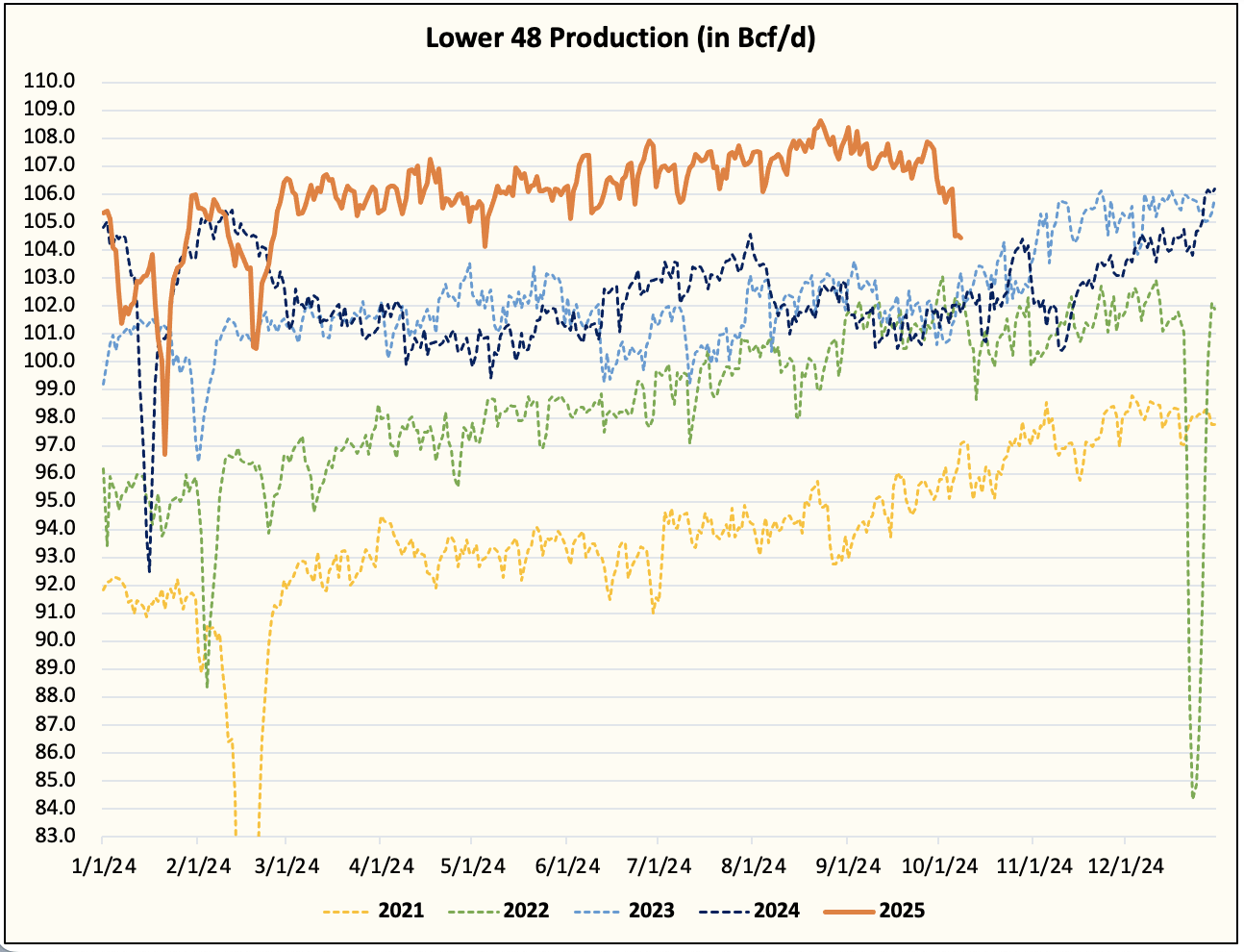 Based on all available pipeline maintenance schedules we’ve seen, Lower 48 gas production is expected to return to ~107 Bcf/d by the end of next week. This means that the 10/17 balance will likely be tight, with 10/24 balances returning to normal.