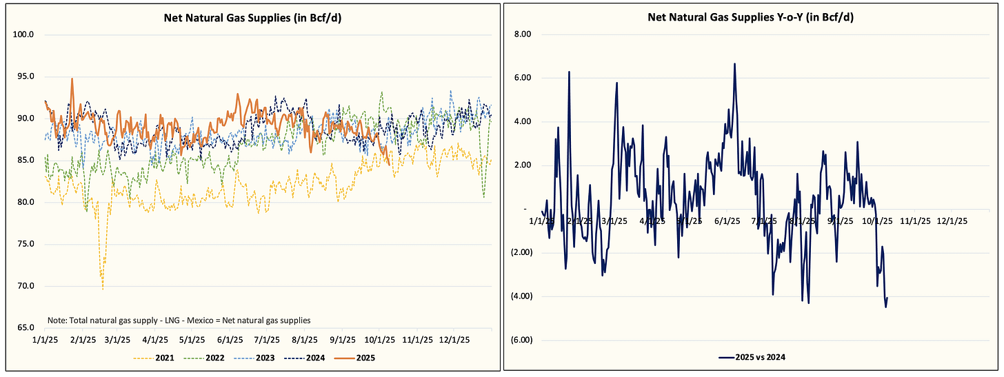 The material drop in production has sent net gas supplies lower y-o-y by ~4 Bcf/d.