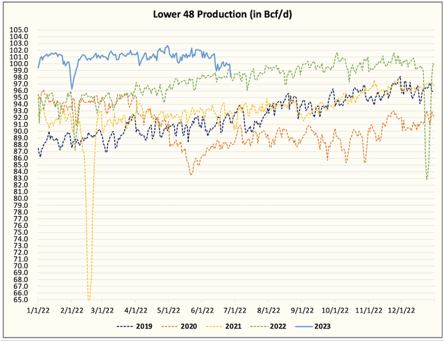 That's not the case this year. Natural gas production is losing momentum into Q3, which brings about another new scenario into play: a possible decline into year-end.