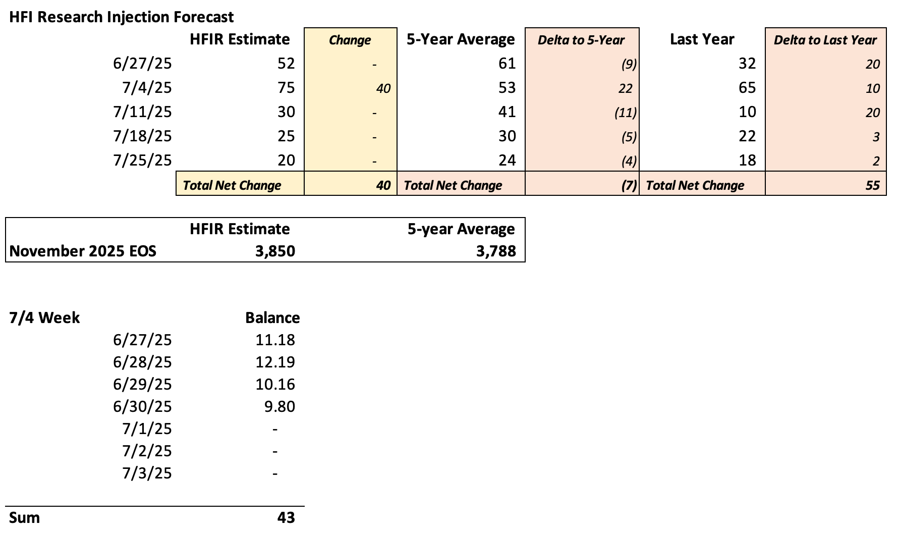 Looking at the implied balances for 7/4 week, our previous assumption was for storage injection to be between 35 to 45 Bcf. This would have been much tighter than the 5-year average of +53 Bcf and last year's +65 Bcf.
