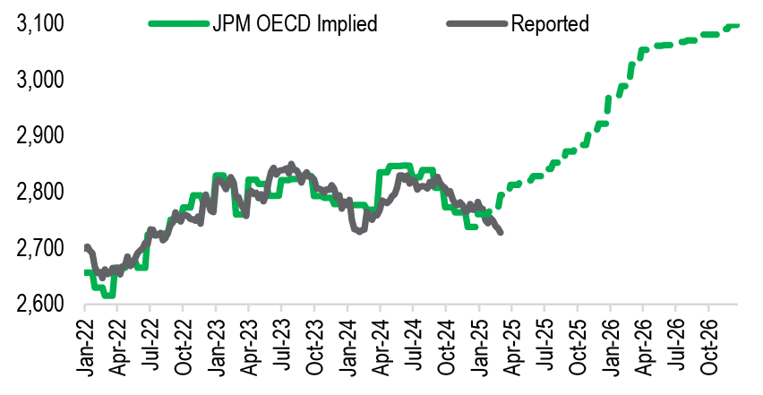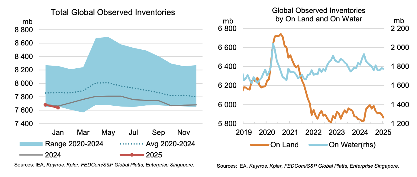 Global observed oil stocks fell by 40.5 mb in January, of which 26.1 mb were products. Non‑OECD crude stocks plunged by 45.3 mb, dominated by China where imports declined. Total OECD stocks rose by 11.2 mb, boosted by a 25 mb build in industry crude inventories. Oil on water fell by 6.7 mb. However, preliminary data for February show total global oil stocks rebounded, lifted by an increase in oil on water.