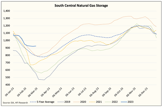 South Central gas storage is sitting at 925 Bcf or close to 125 Bcf higher than the 5-year average. This will serve as a meaningful headwind for natural gas prices during the injection season. Until we see South Central gas storage fall below the 5-year average, you can kiss the possibility that traders frantically buy up gas goodbye.