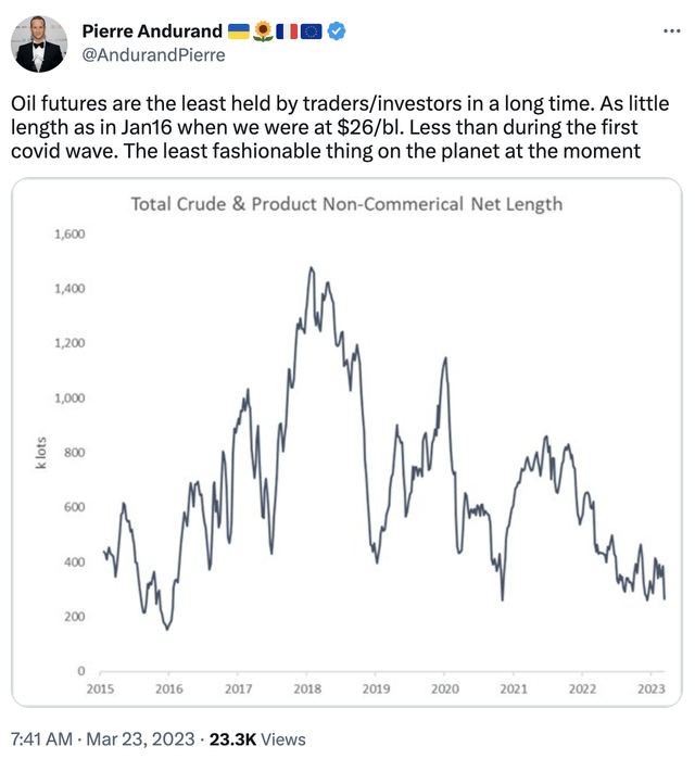 As Pierre Andurand pointed out today in a tweet, this is one of the lowest net length positions on record.