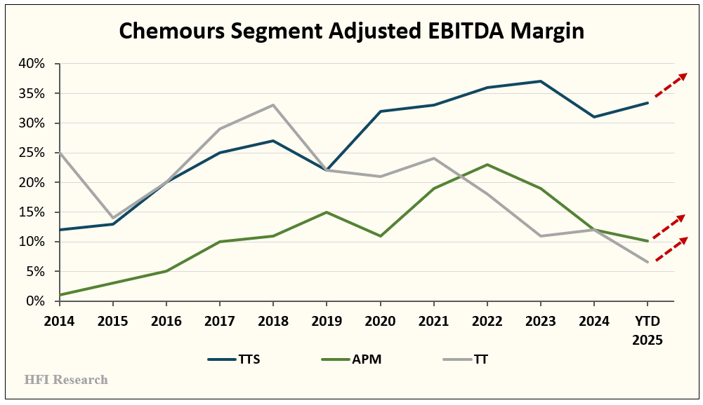 I’ve written that the titanium dioxide market is poised for a cyclical recovery. The TT segment’s Adjusted EBITDA contraction is responsible for the lion’s share of Chemours’ Adjusted EBITDA decline over recent years, so a recovery will likely drive Chemours’ combined Adjusted EBITDA significantly higher.