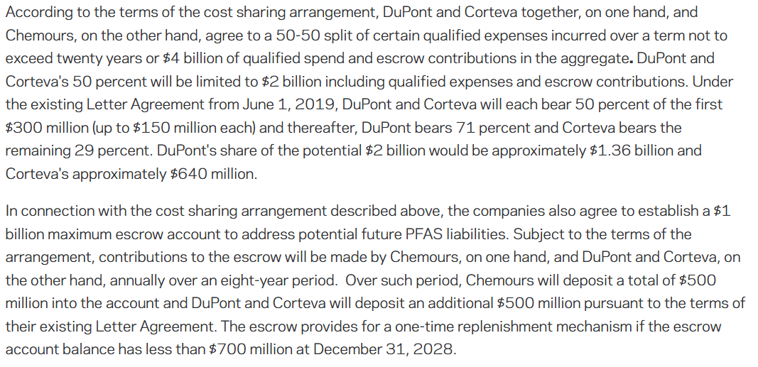 In 2021, Chemours, DuPont, and DuPont’s agriscience spinoff, Corteva (CTVA), entered into a settlement to resolve legal disputes and established a cost-sharing arrangement to support future PFAS liabilities. The terms of the settlement are spelled out in this press release, a key part of which is excerpted below: