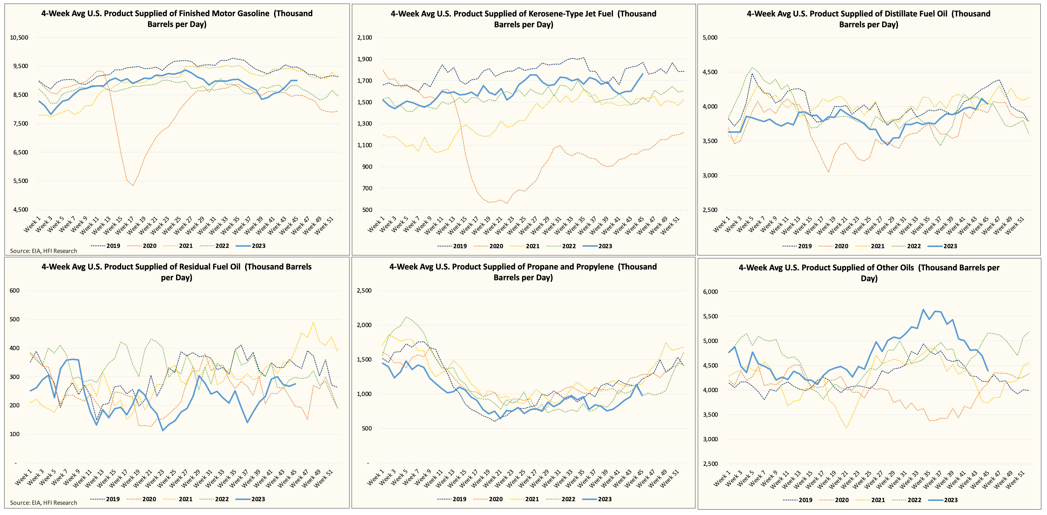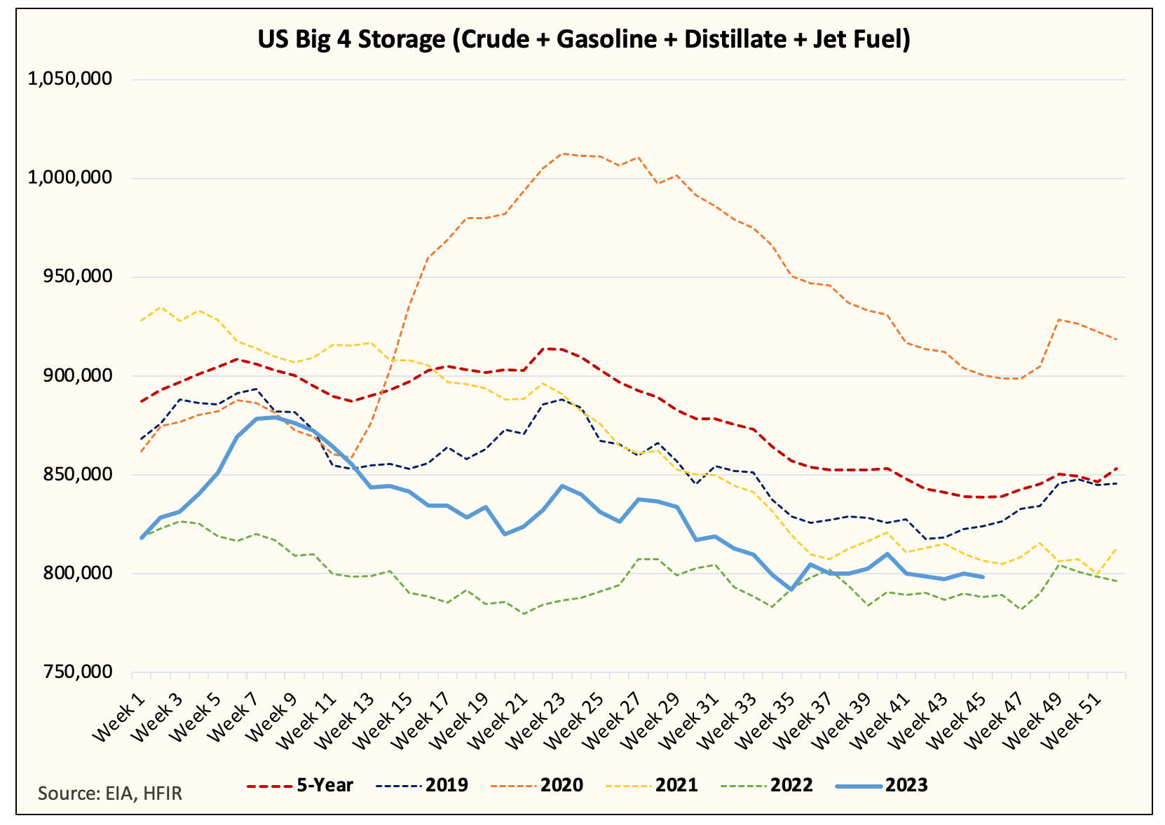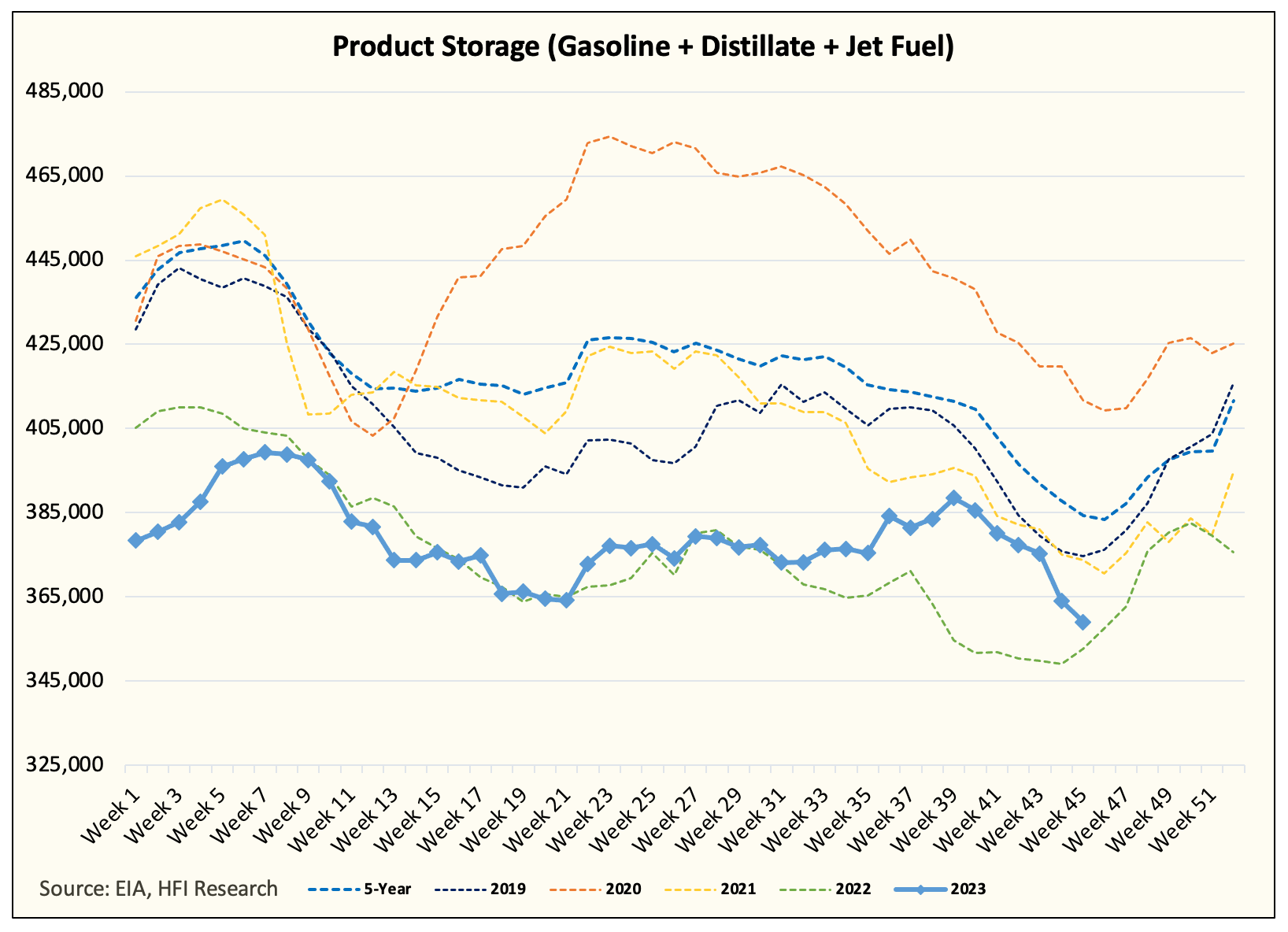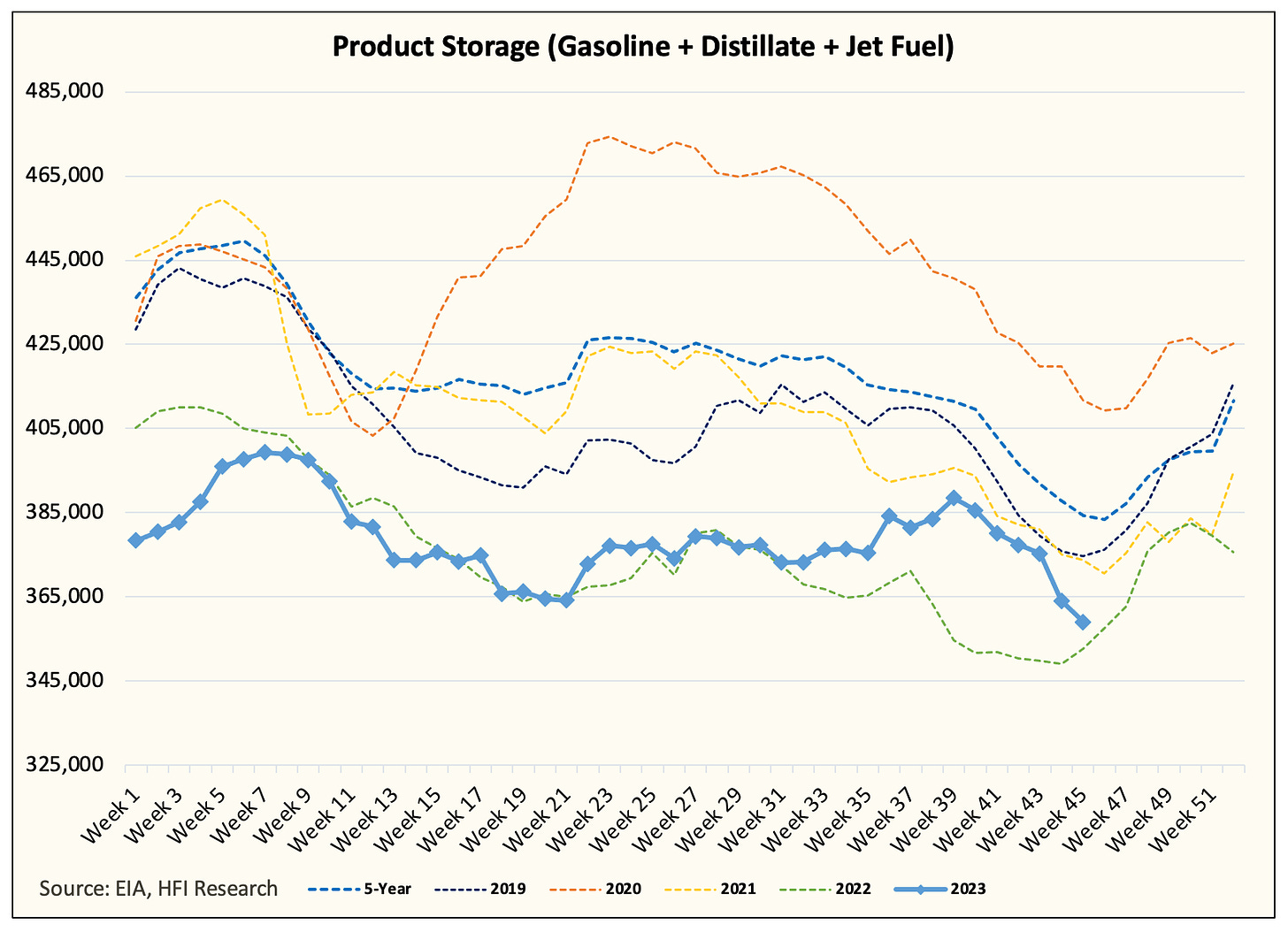 Now if you take a step back and look at the whole picture, it was a boring picture. Product storage draws offset the crude build, so the end result was that storage came in flat.