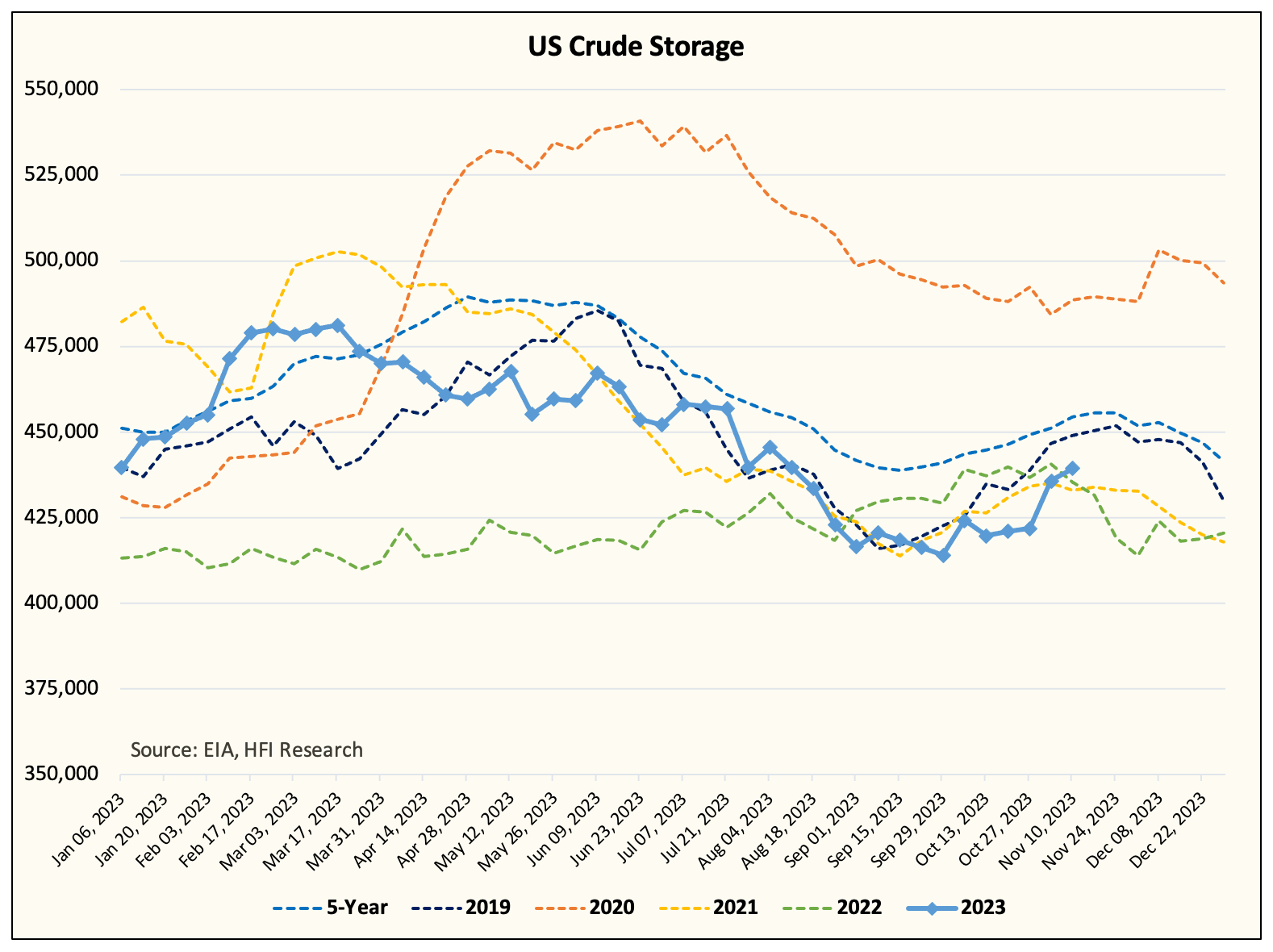 But as product storage decreases further and winter heating demand starts, refinery margins should continue to improve prompting higher buying down the road. If the Saudis agree to a voluntary production cut extension into 2024, then the backwardation should return, and flat prices should get an uplift.
