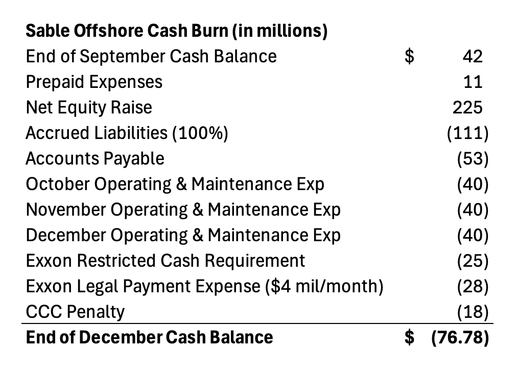 By the end of December, Sable’s cash and cash equivalents will be negative. The company could prolong its death a few weeks, but the accounts payable will stack up, and another $4 million to Exxon will be due in January. Meanwhile, Sable’s legal bills are stacking up, and even using Sable’s $25 million per month burn rate to start 2026, it won’t have enough money to survive January.