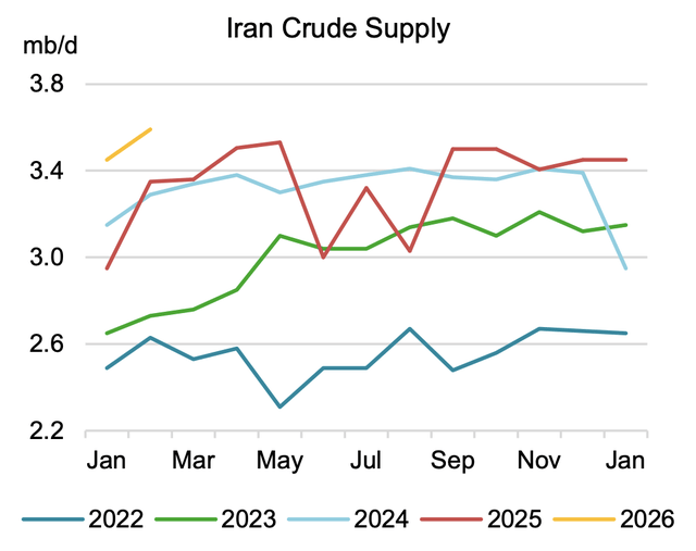 The chart above, based on Kpler data, does not include all shadow-fleet volumes. IEA estimated that Iran’s production is near 3.55 million b/d, or just 250k b/d below the 2018 highs.