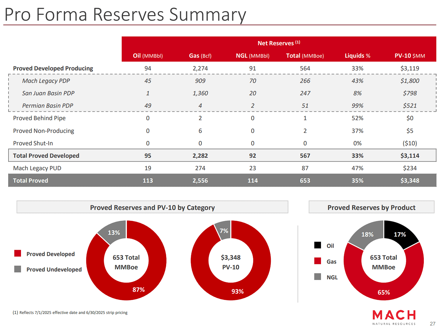 Mach projects 2026 production of 151,000 boe/d, with a 71%/29% split between natural gas and liquids. Proved reserves total 653 million boe, of which 87% is PDP with a PV-10 value of $3.3 billion. Its reserves are summarized below.