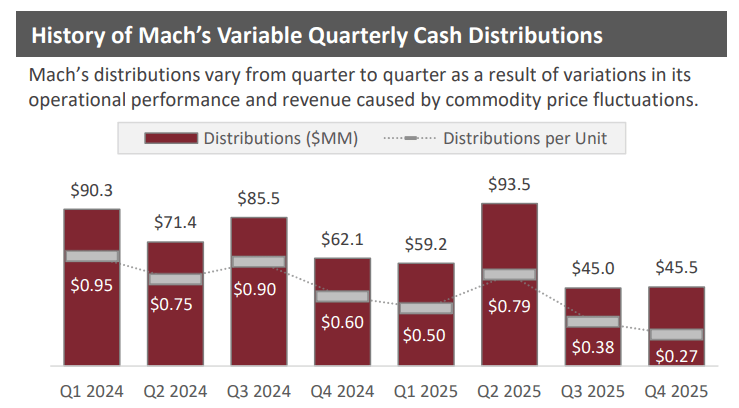 Third, Mach’s units are also out of favor due to the company’s policy of paying variable distributions, which fluctuate widely. For example, the distribution was $0.79 per unit in the first quarter of 2025 and fell to $0.29 per unit in the third quarter.
