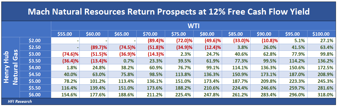 From the current $10.83 unit price, Mach units offer a potential double if WTI trades at $85 per barrel and Henry Hub natural gas trades at $4.00 per mcf. These oil and natural gas prices are in the ballpark with our average price expectations over the coming years as natural gas demand grows globally and non-OPEC crude oil production approaches full capacity after 2027. Of course, returns to Mach unitholders increase significantly as commodity prices increase, as illustrated by the table below.