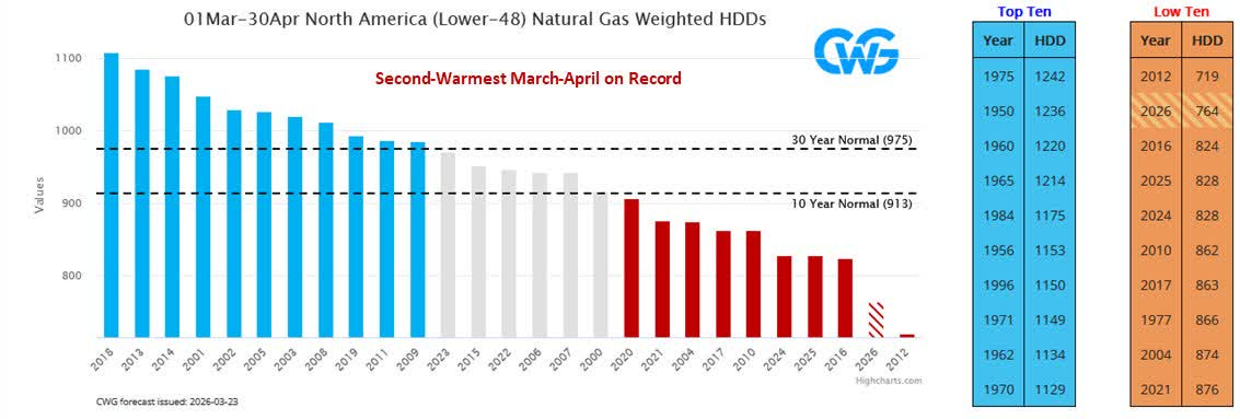 We were definitely wrong on our call when we said that US natural gas prices would be dragged higher as the Strait of Hormuz conflict drags on. US natural gas fundamentals ultimately won as the weather setup for March and April 2026 will be the 2nd warmest stretch since 2000.