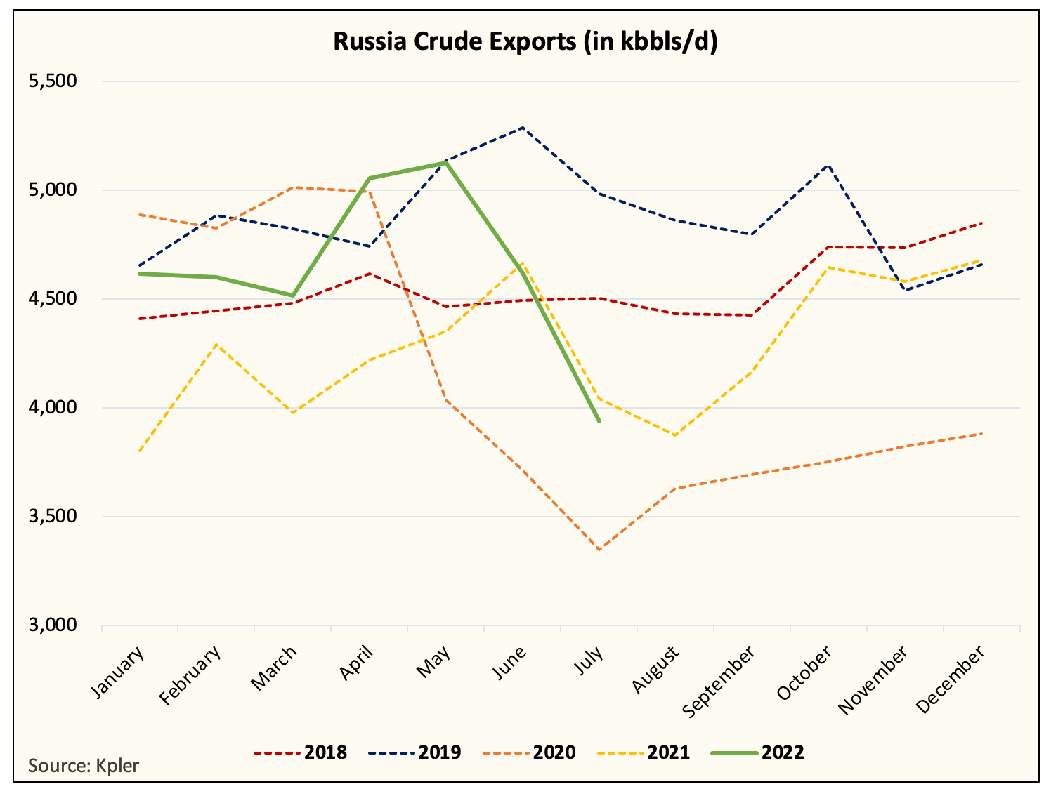 Four months after the Ukraine invasion, Russian crude exports are finally starting to fall. According to mid-month actual export data from Kpler, you can see the crude export drop to ~3.9 million b/d. Now granted, this is only mid-month data so things can still change, but this is the first glimpse of weakness in Russian crude exports.