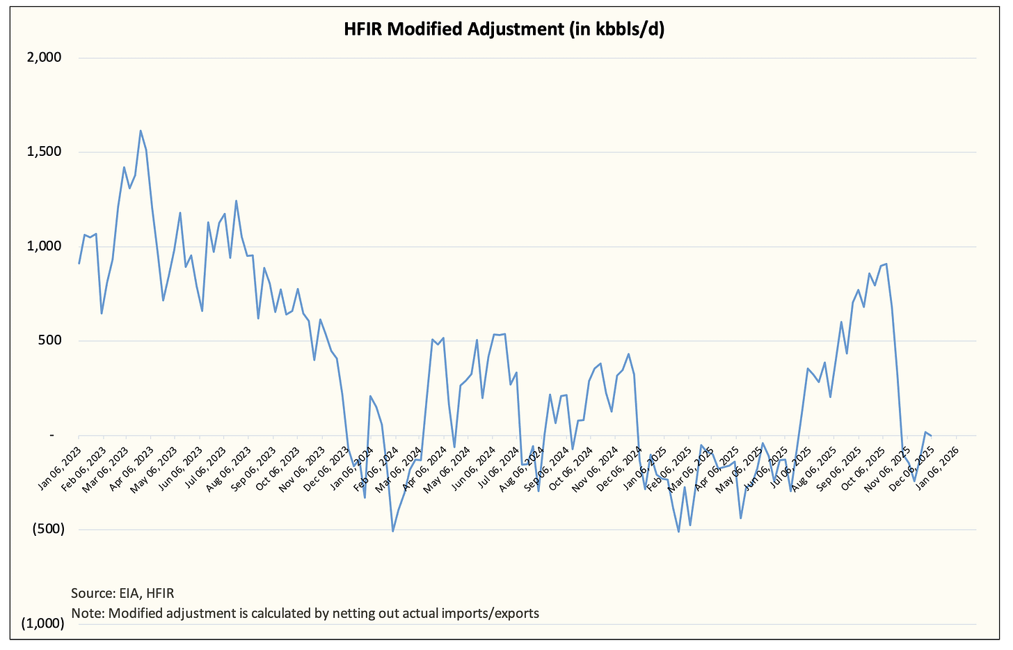 In the first week of November, EIA materially revised higher its weekly US crude oil production figure to ~13.8 million b/d. After it did that, the modified adjustment calculation averaged close to zero.